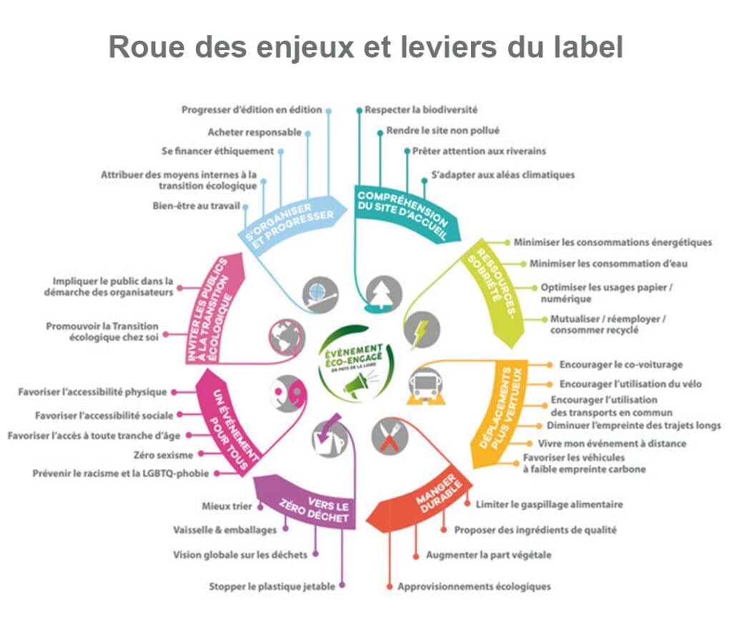 Le Réseau Éco-Évènement (REEVE), implanté à Nantes, a pour objectif de mobiliser l’ensemble de la filière événementielle pour contribuer activement à la lutte contre les dérèglements climatiques. En 2019, le réseau a mis en place un label « événement éco-engagé » à trois niveaux, reposant sur un référentiel de 110 engagements. Ces engagements sont regroupés en 34 leviers, eux-mêmes regroupés en 8 enjeux (voir la roue des enjeux ci-dessous).